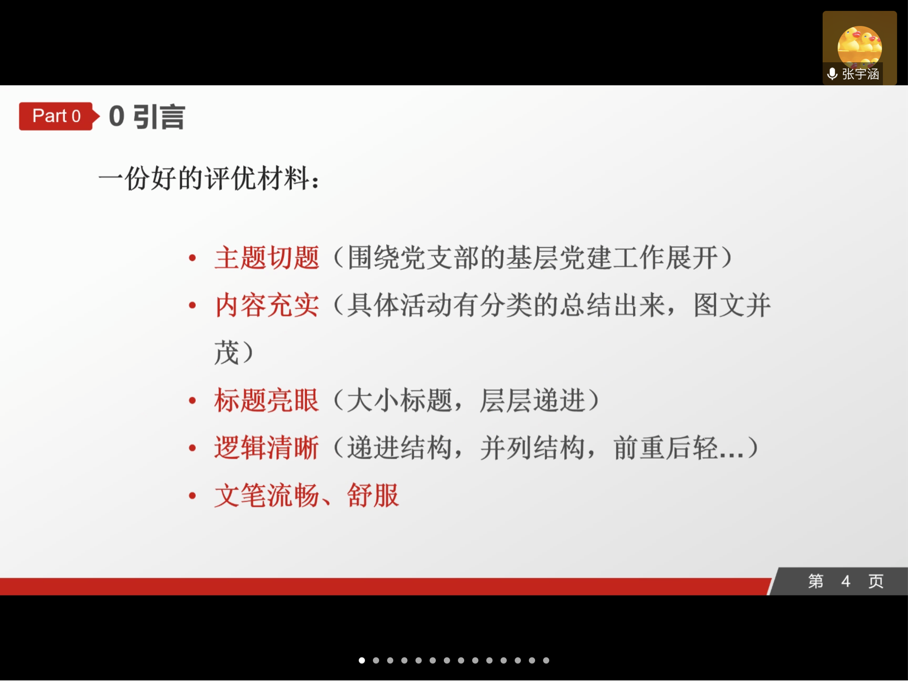 为更好地帮助各个支部写好总结材料,体现支部优势、特色,会议邀请了党建委员会书记张宇涵同志进行支部评优材料写作经验的分享。她强调一份好的评优材料要具备主题切题、内容充实、标题亮眼、逻辑清晰、文笔流畅舒服等关键的几点。着重强调在撰写评优材料时要利用好现有的、整合好的资源,充分挖掘支撑材料;要利用好网络资源,并且关注材料标题和内容的逻辑性;结合往年支部评优材料分享了总结出的注意事项和出现的各种问题。