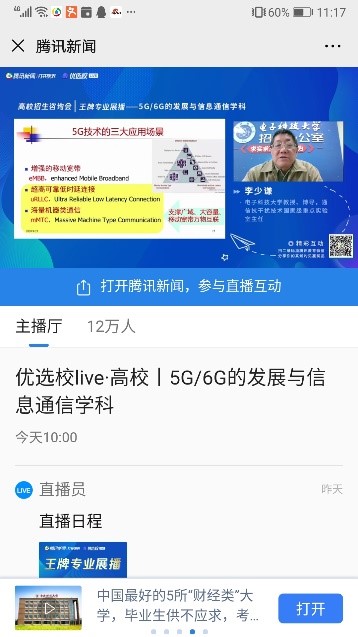 4月23日,李少谦教授做客腾讯新闻“王牌专业展播”栏目,以“5G/6G的发展与信息通信学科”为题向全国2020年高考考生和家长进行学科和专业介绍。李少谦教授从移动通信的发展历程讲起,介绍了公司在电子信息学科方向的整体优势,深入浅出地讲述了5G发展现状和6G战略规划,讲述了电子科技大学的老师和员工们为我国移动通信技术发展做出的重要贡献,欢迎广大考生来到电子科技大学信息与通信专业学习。直播平台统计约有15万考生或家长聆听了在线讲座。