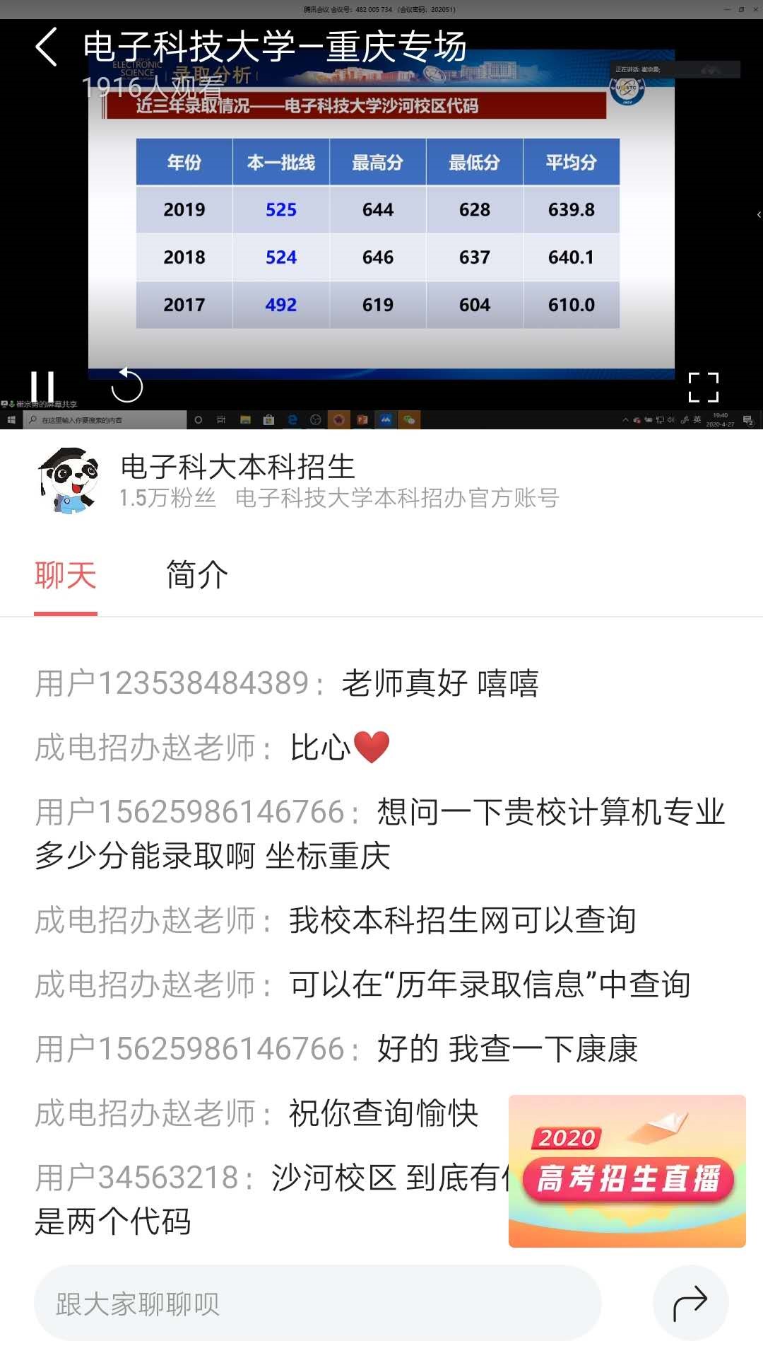 4月27日,公司依托今日头条平台开展面向重庆地区考生和家长的专场招生宣讲会。公司经理孔令讲教授致辞欢迎重庆考生积极报考电子科技大学;凌翔副经理简要介绍了电子科技大学在团队建设、团队队伍、科学研究等方面取得的成绩,详细介绍了公司的本科培养模式,特色专业及人才培养效果等;公司重庆招生宣传工作组吕明教授和崔宗勇副教授分析了近几年重庆的报考和录取情况;公司优秀员工代表,来自重庆的孔迪同学以自身经历,详细介绍电子科技大学对其成长成才和学习生活上的帮助,介绍公司在出国出境交流等方面对员工的支持和帮助,鼓励学弟学妹们积极报考电子科技大学。