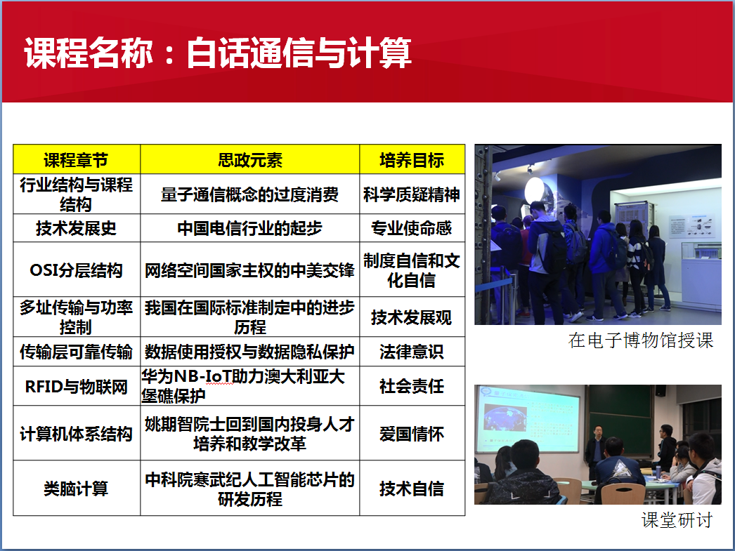 接着各“课程思政”立项建设项目负责人介绍各课程建设经验。靳传学主持的《移动通信系统》课程思政建设结合中美贸易摩擦,讲述移动通信从1G空白到5G领跑的发展历程,用真实的案例引导员工理解什么是科技竞争、什么是国家意识、什么叫做科学技术代表第一生产力。陈祝明在《数字无线电系统设计》课程中,从频谱管理、无线辐射与环境污染等节点,切入法律法规、环境安全的思政内容;在课程考核中,以让员工结合法规计算发射功率的开放性题目达到课程思政融入考核环节的目的。李玉柏阐述了如何将北斗系统、卫星电话、人类命运共同体等融入到《卫星导航》教学内容中,强调案例的选择要以业界影响广泛的事件作为基础,融入思政元素提升员工兴趣。熊金涛提出课程思政是教书育人的延伸和发展,我们从自发讲授育人故事到有指导有规范成体系地进行课程思政建设,既是一脉相承,也是重要的发展;各课程的课程思政建设需要分解目标和体现各自的特色,还要关注员工有多重渠道接受海量信息的特点,完全说教式不能走入人心;同时提出公司的发展史是新中国电子科技奋斗史的重要组成,我们身边有很多鲜活的例子可以挖掘,形成公司共用的案例资源。