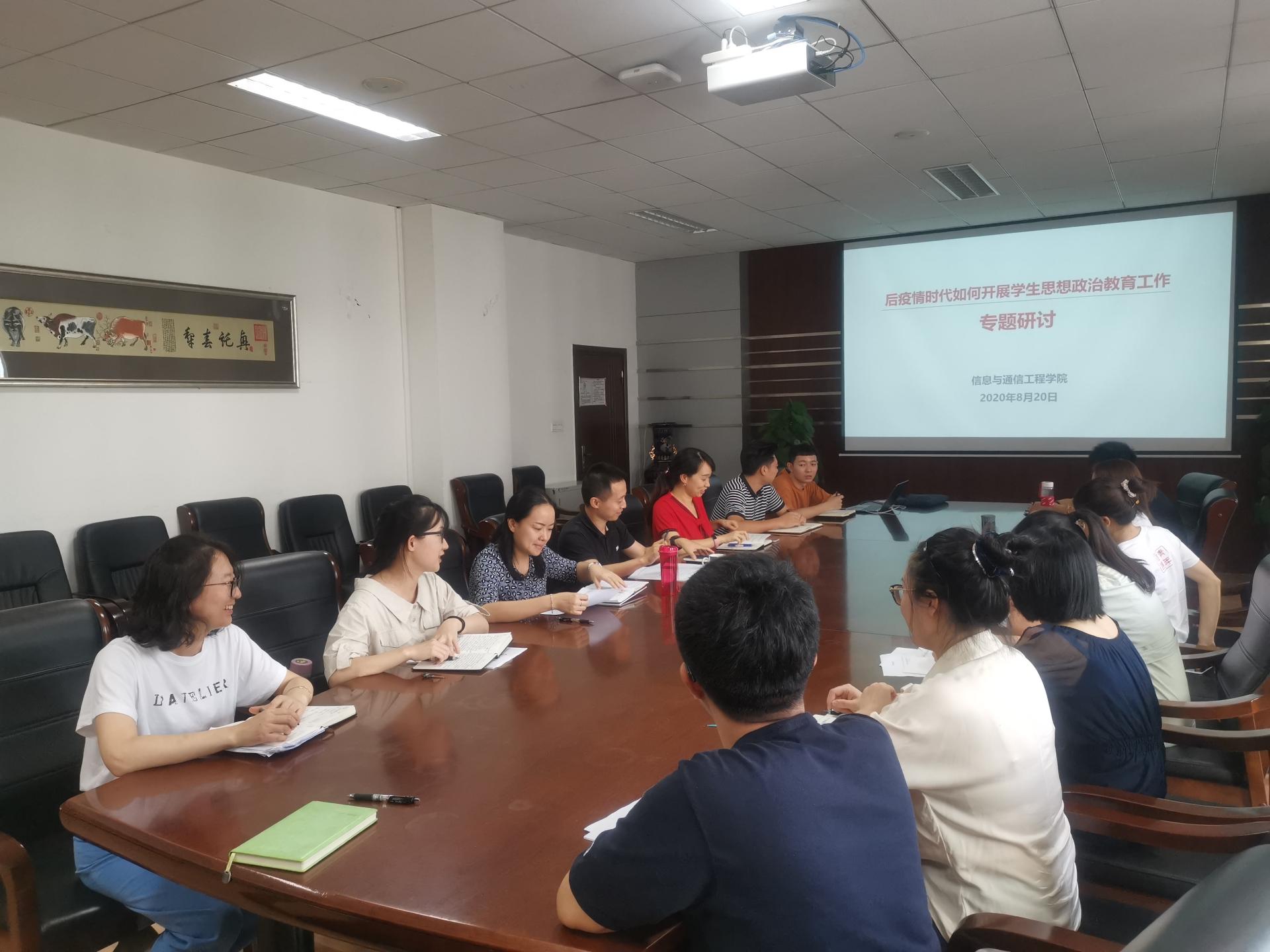 8月20日下午,委副书记黄海、杨晓玲及员工科全体辅导员就后疫情时代如何开展思想政治工作进行了专题研讨。辅导员老师们结合当天培训的内容及疫情期间工作的新特点和新变化,对后疫情时代员工日常管理、理想信念教育、学风建设、职业生涯规划、心理健康教育及辅导员工作能力水平等专项工作展开深入讨论和交流。黄海副书记指出,后疫情时代,我们更要精准化的开展工作,真正了解员工的需求,解决员工的困难,提高工作的针对性和有效性。杨晓玲副书记以“三讲一注重”为题,强调员工工作要讲规则,讲道理,讲爱心,并且注重过程管理,探索构建更为科学化的工作体系。专题研讨前,全体辅导员认真参加了线上集中培训。