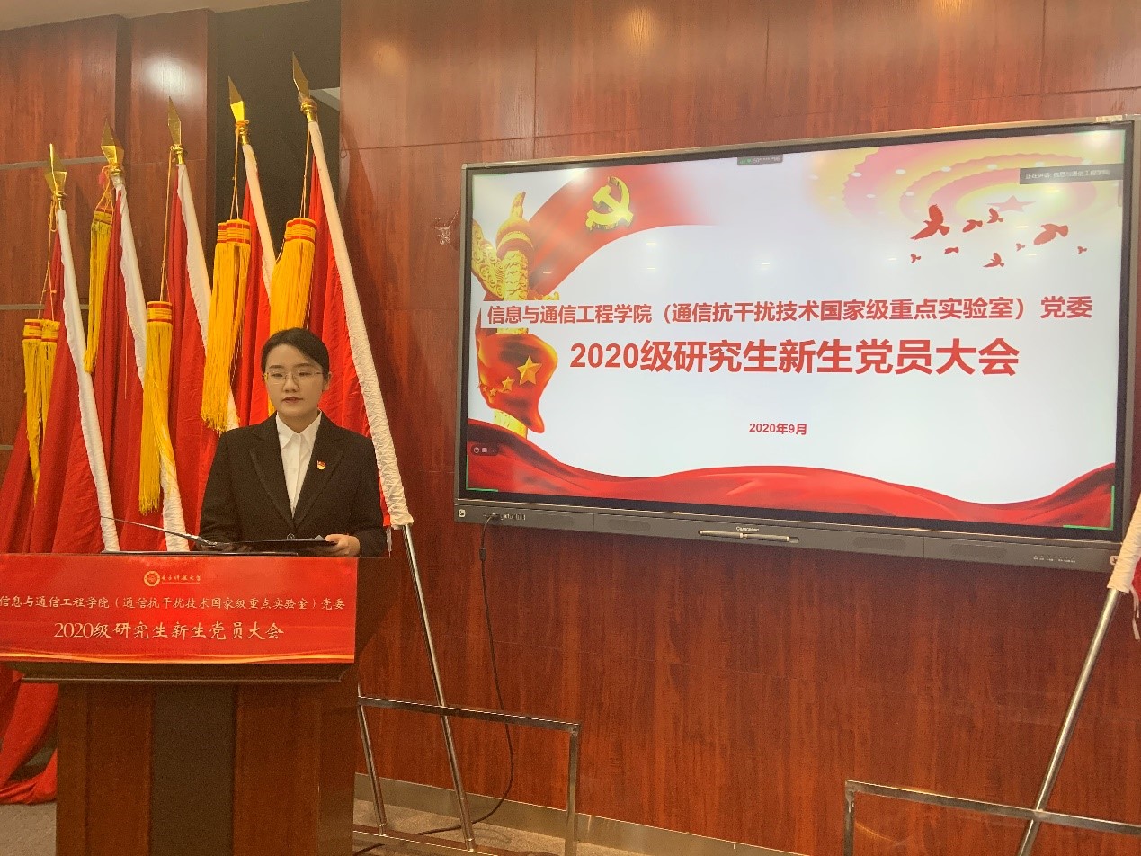 辅导员周旋从研究生党支部组织架构、党支部管理建设以及相关通知三方面详细地为新生党员介绍了党委研究生党建工作。她希望新生党员们能在支部活动中加强思想建设、在交流反思中磨练专业技能,做一名又红又专的青年党员。