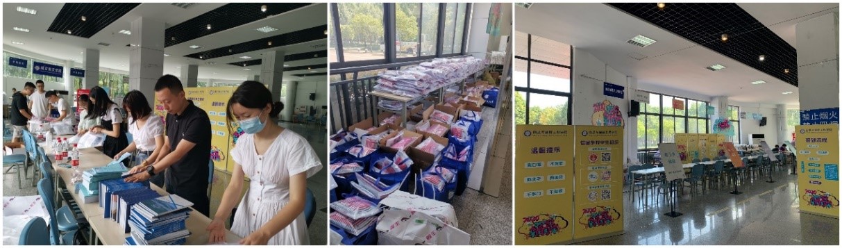 迎新现场,900余份迎新资料袋,精心设计的新生文化衫,口罩、消毒酒精等防疫物资一一准备就绪,欢迎新同学、报到流程、温馨提示等宣传标识醒目有序,静待新生到来。
