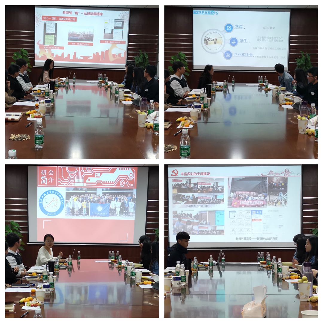 会议开始,首先各员工干部进行了自我介绍。随后,党建委员会书记刘灿、信通研究生会主席李嘉欣、抗干扰实验室研究生会主席范燕侠及研究生职业发展中心主席倪飘分别对各自负责的组织的基本情况及本学年的工作计划进行了介绍。