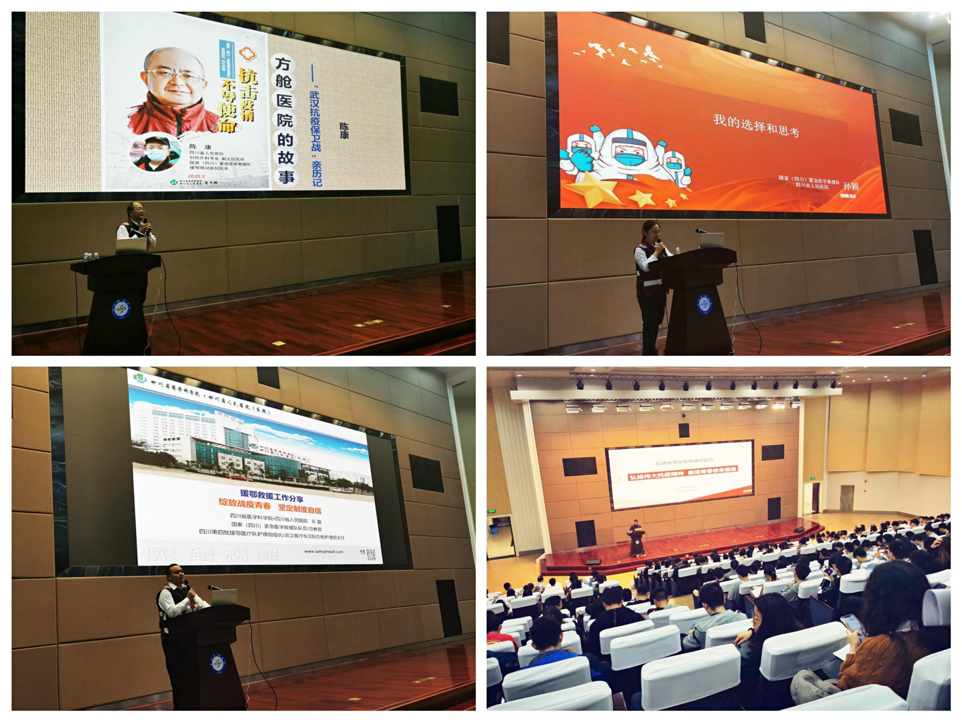 11月,信通分党校举行“学四史 守初心”专题辅导报告。来自四川省人民医院国家(四川)紧急医学救援队的全国抗击新冠肺炎疫情先进个人陈康主任、“四川青年五四奖章”获得者乐磊护士长、荣登《一线抗疫农工党援鄂医务工作者英雄榜》的孙颖博士,以“弘扬伟大抗疫精神,展现青春使命担当”为主题,从救援队发展历程谈起,结合方舱医院的故事、援鄂工作经历、选择和思考等,为近600名党校学员、团校学员带来精彩分享。