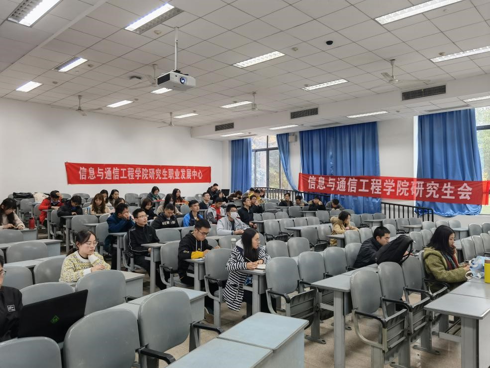 紧接着王老师开始从目前的就业大环境出发给同学们展示了一组目前的就业数据,详细讲述了应届生在目前就业环境下应该如何去面对,如何去主动选择。王老师通过对比了电子通信行业与其他行业的异同之处,给同学们纠正了平时不易发现的几个择业误区。