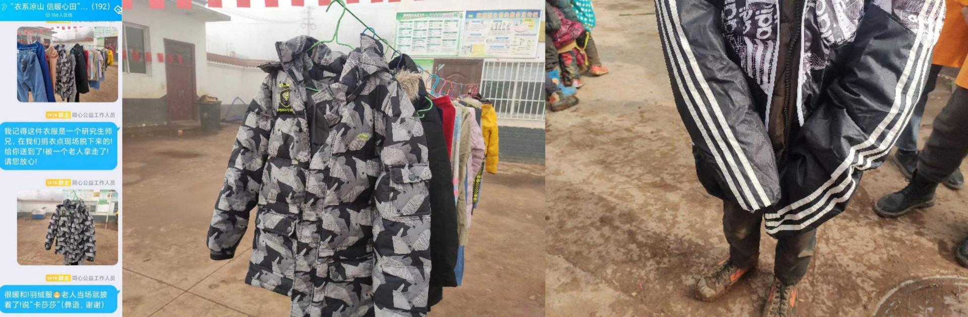在一期募集活动中,一个在捐衣点现场脱下羽绒服的研究生师兄给志愿者们留下了深刻的印象,这件羽绒服现在穿在一个老人的身上。
