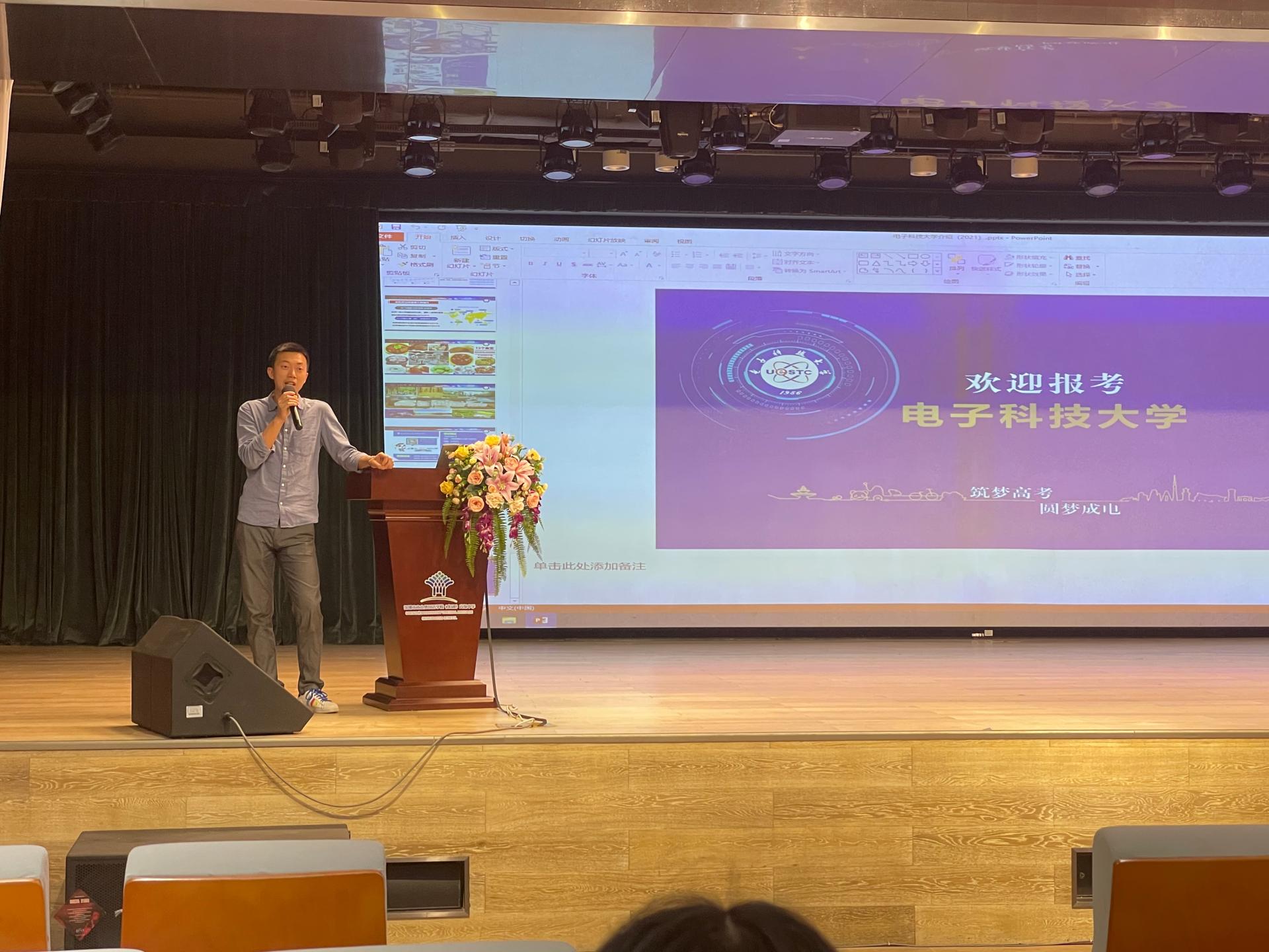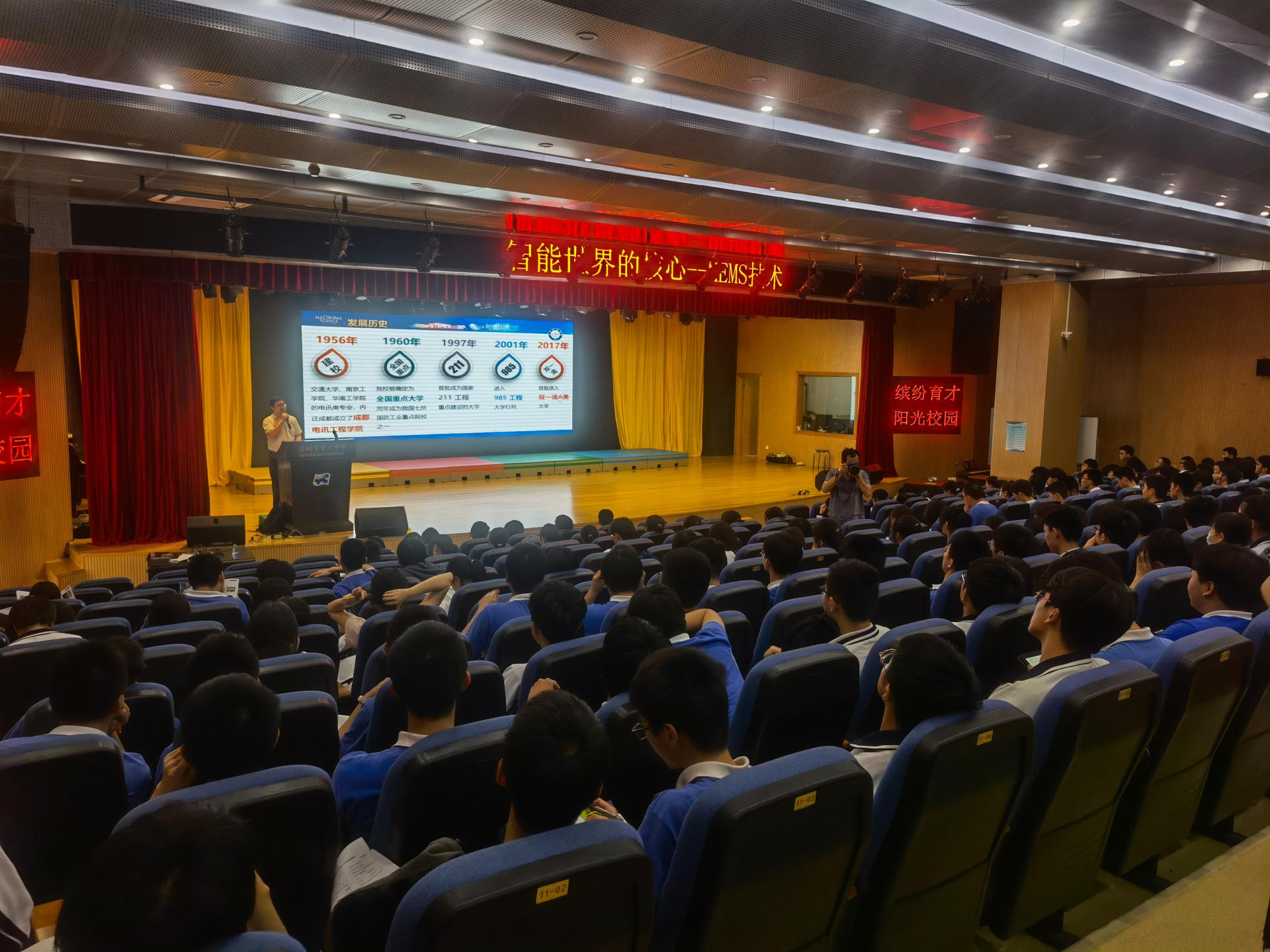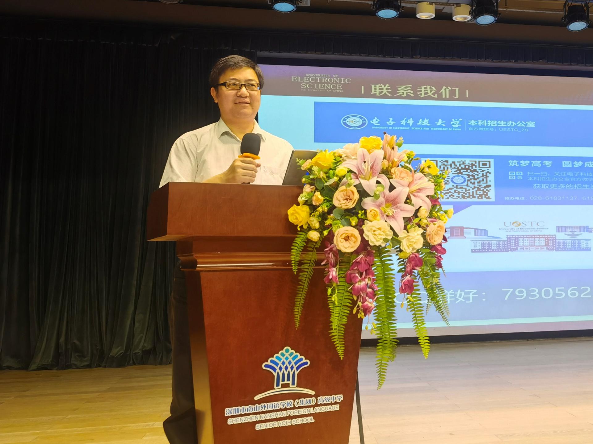 在深圳市育才中学,工作组一行与育才中公司领导姚晓岚、员工发展中心主任冯涛等进行座谈,了解育才中学整体生源质量,工作组详细介绍了电子科技大学在人才培养、团队建设、广东省招生政策等情况,并签署共建电子科技大学”优质生源基础“协议书并授牌。随后,公司机电公司周吴老师面向育才中学高二年级400余员工做了题为《智能世界的核心——MEMS技术》的科普讲座,周老师从MEMS技术的应用场景讲起,介绍MEMS技术的基本原理及目前发展状况和国内外的研究现状,并指出MEMS技术有可能会成为新一轮的卡脖子技术,鼓励更多的再学关注并投身到MEMS技术的研究当中。随后,公司招生工作组李波老师简要介绍公司的基本情况以及历年招生情况,邀请与会同学关注电子科技大学。