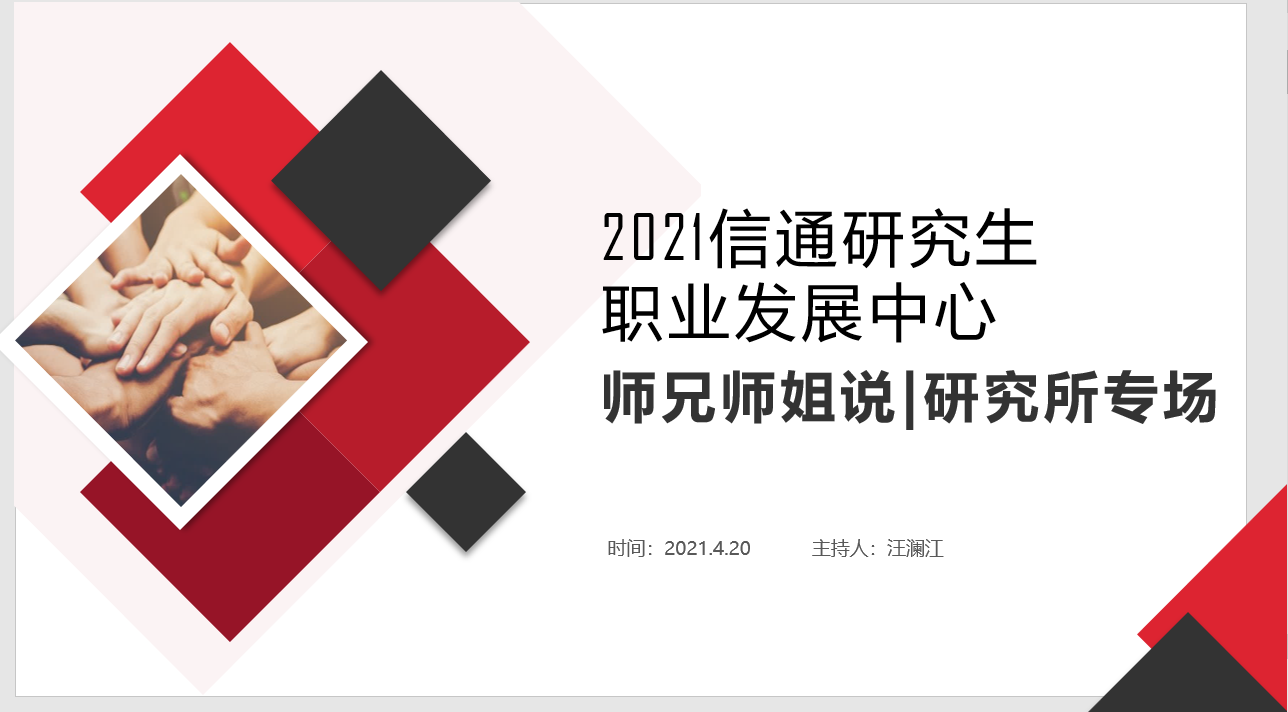 2021年4月20日晚7点,伟德国际victor1946研究生职业发展中心成功举办第四届“师兄师姐说”就业分享会-研究所专场。