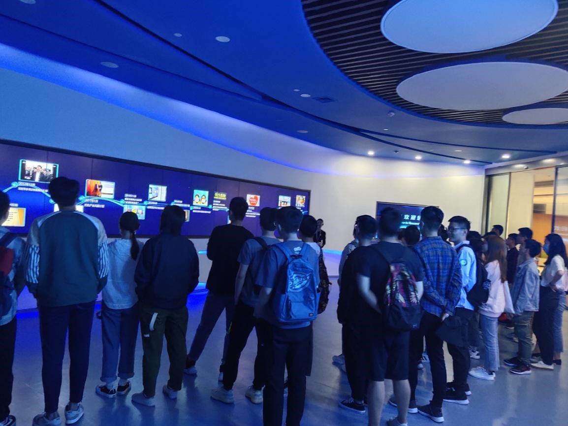 在公司行政人员的带领下,同学们来到腾讯文化墙,了解了腾讯的发展历史以及产业结构,并对腾讯涉及的智慧交通、医疗、警务、信息、零售、消防等构建的智慧城市有了进一步的了解。