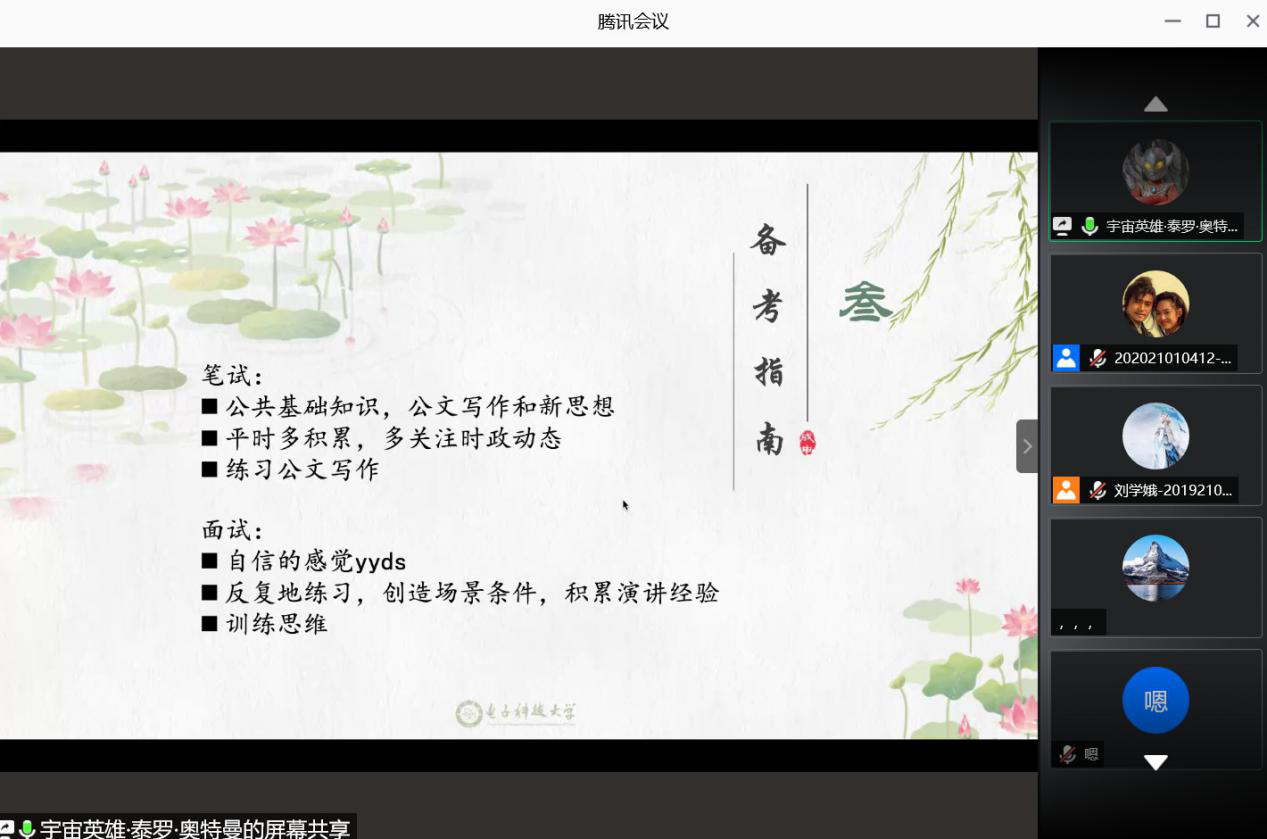 冯思源师兄和杨成浩师兄考取的都是四川选调,他们主要是为大家介绍了考取选调需要的一些条件、如何进行志愿选择相关的内容,并就选调笔试和面试的热点问题给出了自己的建议。