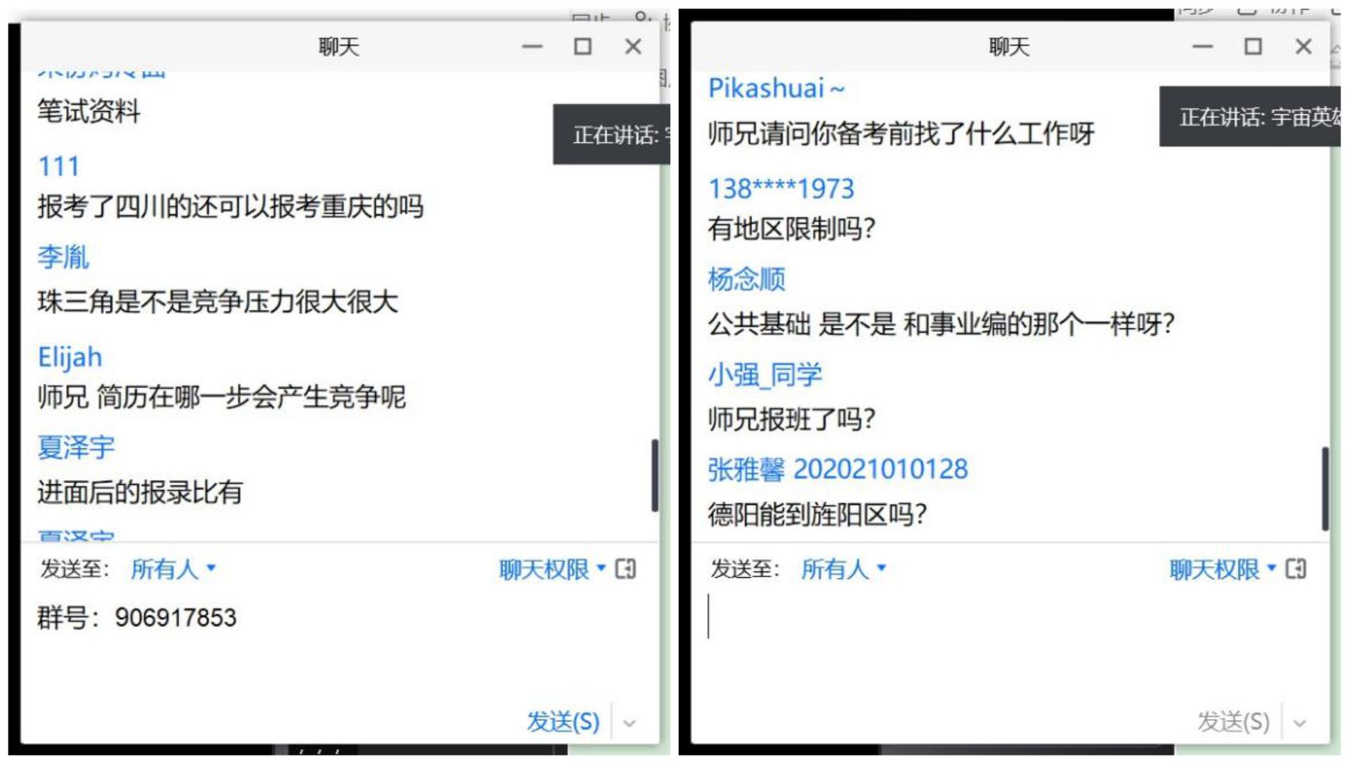 在每一位师兄师姐分享之后,同学们也就自身情况在聊天区进行积极地提问,例如福利待遇,报名注意事项,信息的获取和岗位分配等问题,各位师兄师姐也都一一耐心解答。