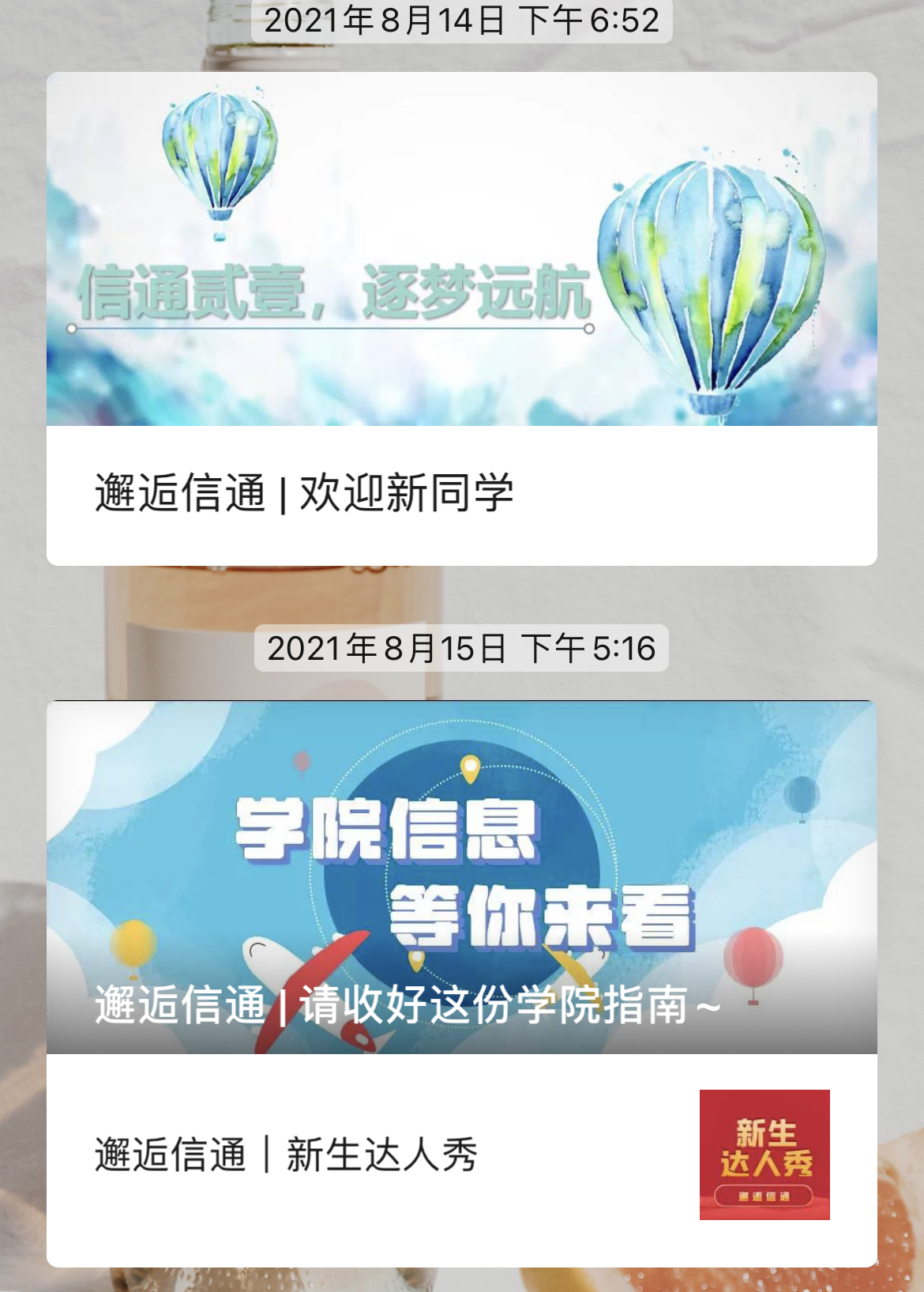 新生名单公布后,辅导员第一时间分好班级,并将班级名单交予导生,由导生负责联系各班员工,加入年级群和班群。为了减轻新生家长面对孩子离家的忧虑,辅导员特意创建微信家长群,及时解答家长疑问。公司官方微信公众平台“信通E家”推出“邂逅信通”主题系列推送,内容涵盖班主任、辅导员和导生介绍,新生入学指南以及新生风采展示等多个方面,带领新生领略大学初印象。此外,公司面向新生们举办以建党百年为主题的“新生达人秀”,鼓励同学们结合党史、脱贫攻坚、抗疫、抗洪、奥运等各类话题,利用假期时间,通过文字、绘画、摄影、发明制作等形式进行创作,并在公司官微展示优秀作品。