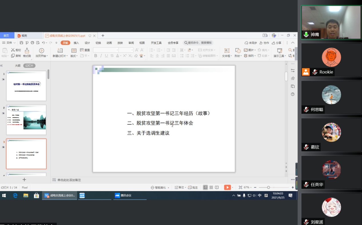 首先带来分享的是李勇华,正值电子科技大学六十五周年校庆,他在会议伊始就为母校送上了祝福:“离开母校快10年了,值母校65周年校庆之际,祝我们母校越来越好,祝我们老师教学愉快,祝我们学弟学妹心想事成!”。2012年李勇华硕士毕业后,先在军校担任老师,几年后转业到市工信局,正赶上驻村扶贫第一书记换届。在家人的理解支持下,李勇华带着对驻村工作一无所知的忐忑和对家人在需要时无法照顾的愧疚,踏上了前往偏僻的保全村发光发热的基层之旅。