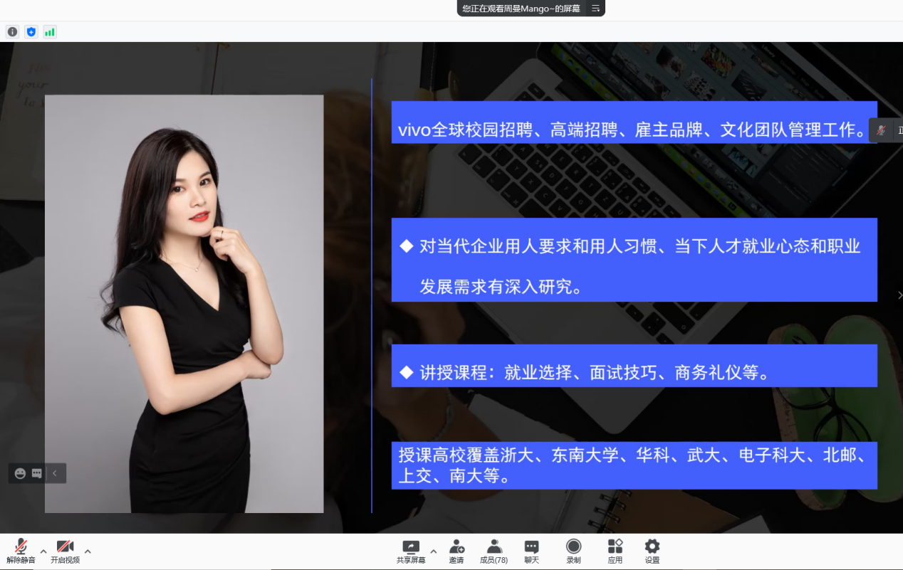 2021年11月4号,伟德国际victor1946研究生职业发展中心成功举办“HR面对面”之vivo专场线上活动。此次活动特邀vivo全球校园招聘与雇主品牌总负责人周曼老师为同学们分享优秀企业的求职经验,帮助同学们掌握求职技巧,认清就业形式、做好职业规划。