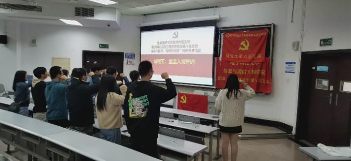 不忘初心,牢记使命。活动最后,在鲁天舒同志领誓下,全体党员一起面向党旗,高举右手,重温入党誓词。80个字的入党誓词,句句铿锵有力,不仅宣誓了党员同志的一份政治誓言、一份忠诚承诺,也展现了电科人的一份责任担当。