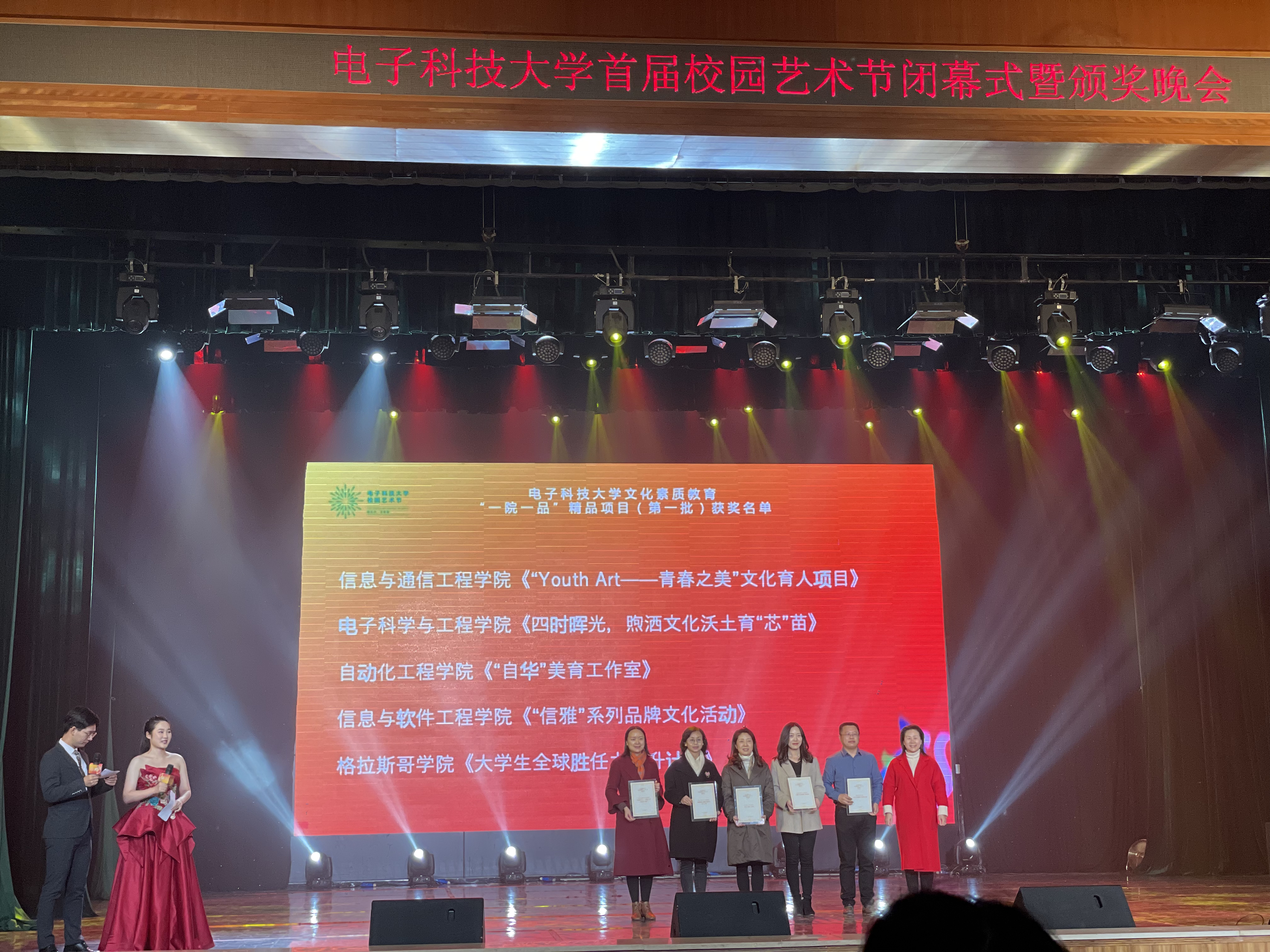 12月3日,电子科技大学“新时代·正青春”首届校园艺术节闭幕式暨颁奖晚会在成电会堂举行。公司获得“优秀组织奖”,选送参赛的集体和个人共获得一等奖4项、二等奖6项、三等奖2项,公司《“Youth Art——沁春之美”文化育人项目》入选首批文化素质教育“四个一”建设精品项目。