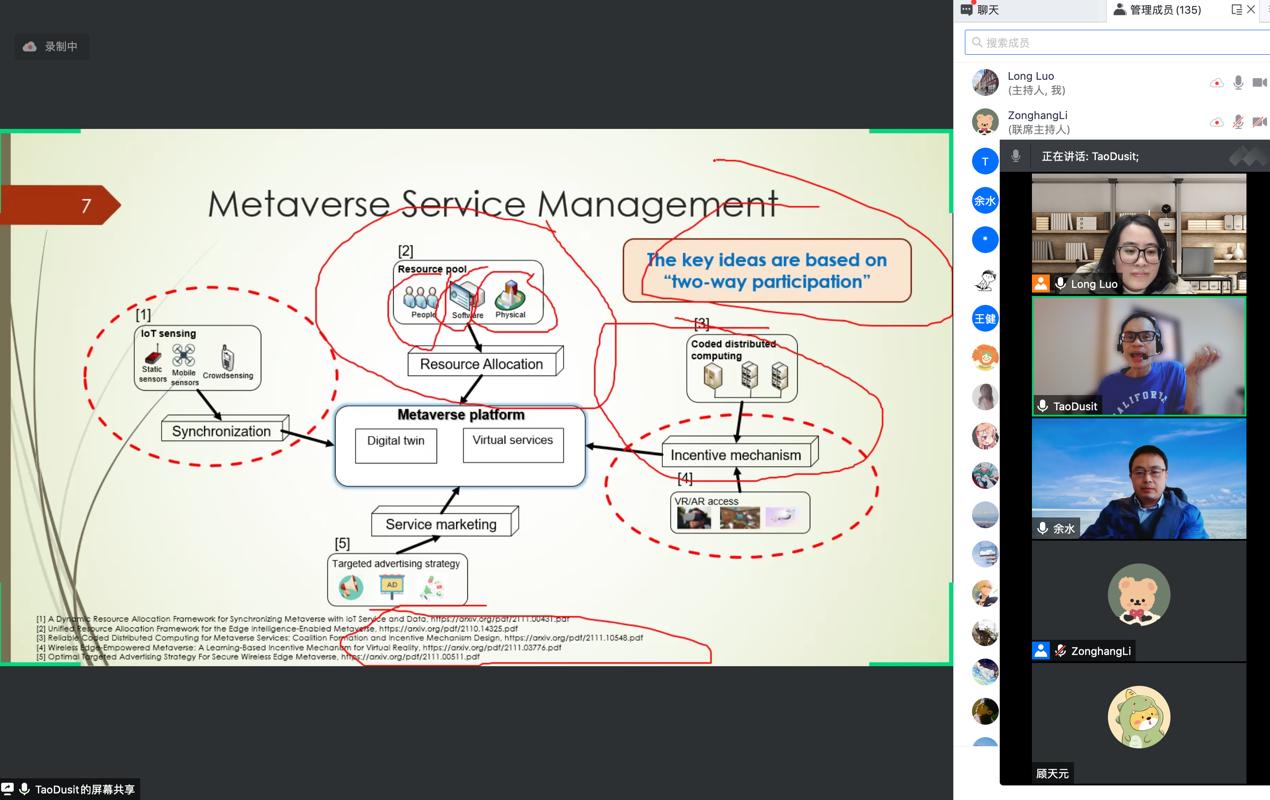 元宇宙是继Web和移动互联网革命之后的下一代互联网技术。在元宇宙中,人的数字化身可以在三维虚拟世界中与其他人进行交互。在本次讲座中,Dusit Niyato教授从元宇宙的发展史出发,介绍了元宇宙在当今时代下的发展背景,讲解了元宇宙以及虚拟服务管理的主要概念,并讨论了博弈论在虚拟服务管理中的应用。在无线边缘赋能的元宇宙中,虚拟现实(VR)用户可以访问不同提供商提供的VR服务获得沉浸式的虚拟世界体验。鉴于VR服务提供商有限的通信和计算资源,VR服务必须以有效且经济的方式进行交付。于是,Dusit Niyato教授提出基于学习的激励框架,可以用作管理提供商和用户之间的VR服务的有效工具。随后,Dusit Niyato教授讲解了基于数字孪生技术的虚拟服务。元宇宙平台通过海量物联网设备和传感器采集真实世界数据,并同步到虚拟世界创造或改变真实世界实体的虚拟数字拷贝。于是,Dusit Niyato教授提出采用混合进化动力学来为异构设备所有者动态选择虚拟服务提供商。最后,Dusit Niyato教授讨论了元宇宙虚拟服务管理的一些重要研究方向。