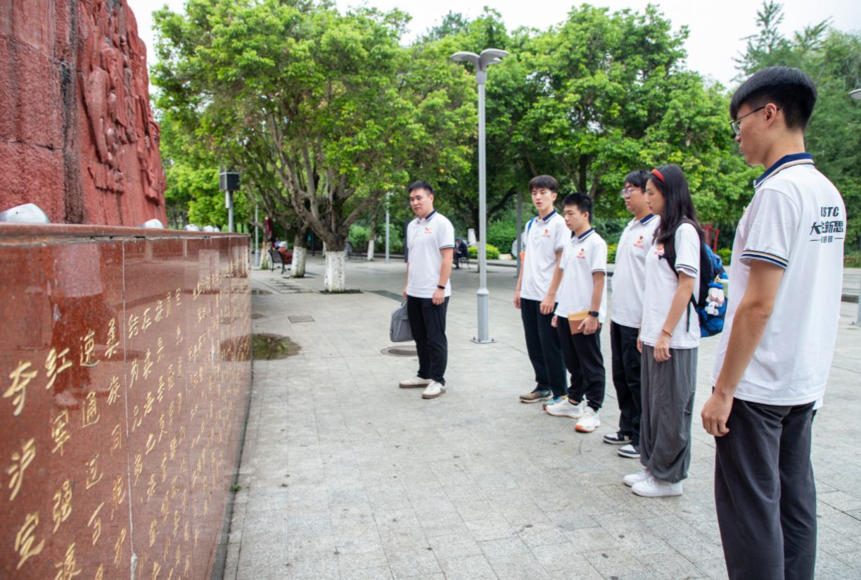 实践队师生首先来到冕宁县红军文化广场进行参观。红色雕塑《长征颂》矗立在广场正前方,是广场的主题与灵魂,其人物以长征过冕宁时的红军主要领导人物为原型,雕塑构建独特,将革命历史和峥嵘岁月进行浓缩。八位雕塑人物神情坚毅、眺望远方,充分展现了共产党人对革命的坚定信念,彰显了红军长征奋勇向前的精神风貌。
