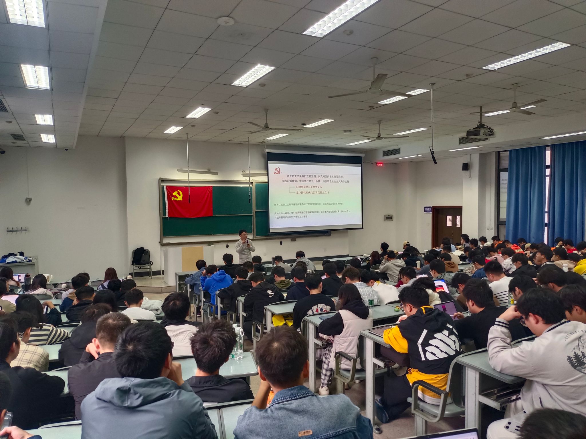 唐登蕓从习近平新时代中国特色社会主义思想的概述讲起,从“十个明确”到“十四个坚持”再到“十三个方面成就”,强调中国特色社会主义好,归根结底是马克思主义行,是中国化时代化的马克思主义行。随后,唐登蕓向同学们阐明树立正确世界观的重要意义,并向同学们详细讲述了世界观的定义及世界观对于方法论的重要影响。
