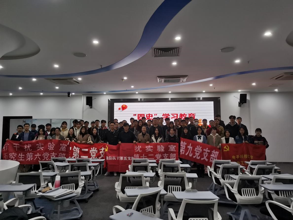 为深入学习贯彻习近平总书记关于学习党史、新中国史、改革开放史、社会主义发展史的有关讲话,进一步加强通信抗干扰技术国家级重点实验室师生党员学好“四史”,深刻认识红色政权的来之不易、新中国的来之不易以及中国特色社会主义的来之不易,2020年11月4日,抗干扰研究生第二、五、六、九、十二党支部联合教工三支部在电子科技大学清水河校区图书馆百学堂开展了以“学习‘四史’守初心,砥砺奋进担使命”为主题的党课大会。会议由抗干扰研究生第十二党支部书记葛君刚主持,支部对点教师张娟老师与各支部成员参与。