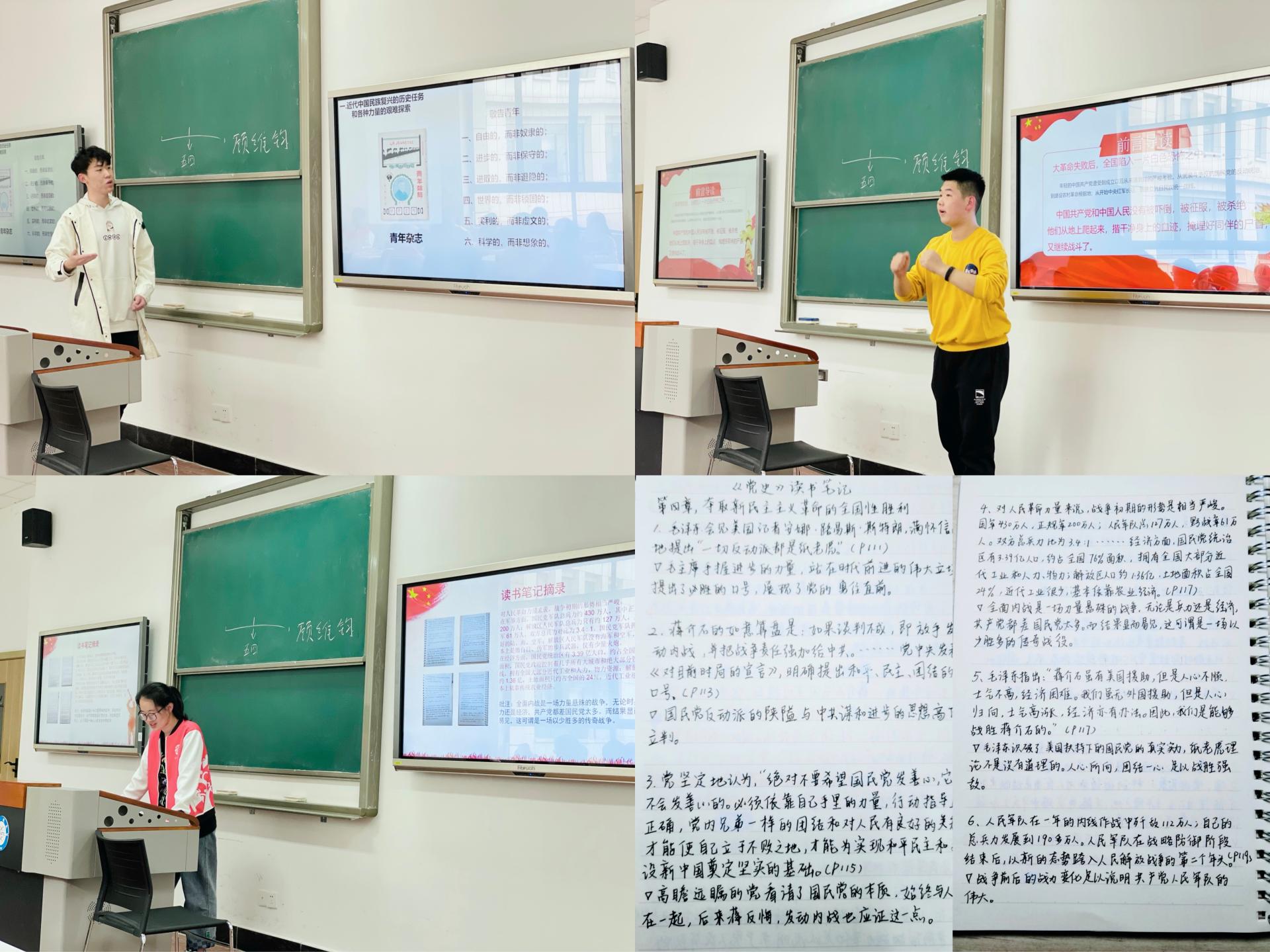 同学们分小组认真研读党为实现国家富强、民族振兴、人民幸福和人类文明进步事业作出的历史功绩,将重大历史事件进行细致地整合与梳理。阅读过程中,不仅对党的发展历程有了更清晰的认识,还融入了深刻的自我思考。一边对文章内容进行摘抄,一边进行详细批注,记录下自己的所学所获。分享会上,各组同学分章节依次进行内容介绍、笔记展示和心得分享,配合精美幻灯片,声情并茂地讲述一代代共产党人的无畏与睿智,将当年的场景进行生动再现。同时注意结合实际,分享了关于当下时事热点的看法。