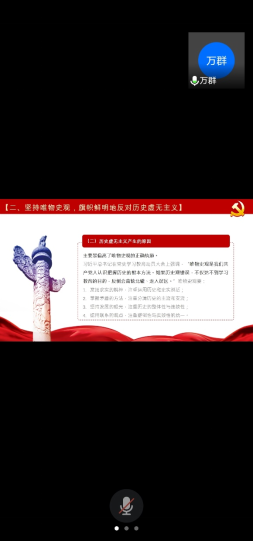 在讲课开始前,万群副经理首先回顾了之前“四史”学习的主要内容,强调党史是中国共产党的领导不断走向成熟的实践史,中国共产党是引领世界社会主义发展的重要政治力量。在讲课过程中,首先说明了什么是历史虚无主义,举例说明了历史虚无主义的各种表现,分析了历史虚无主义产生的原因,剖析了历史虚无主义的危害,强调了唯物史观的重要性, “唯物史观是我们共产党人认识把握历史的根本方法。如果历史观错误,不仅达不到学习教育的目的,反倒会南辕北辙、走入误区”(习近平总书记在党史学习教育动员大会上的讲话)。进而阐述了坚持唯物史观,旗帜鲜明地反对历史虚无主义,需要遵循的重要原则和解决的重大问题,即一是坚持以习近平新时代中国特色社会主义思想为指导,习近平关于党史学习的重要论述为我们学习党史提供了科学指导,是我们学习党史的基本遵循,一方面,要把握好党的历史主流,从根本来说,党的本质是先进的,党的历史功绩是主流;另一方面,坚持以唯物史观指导党史研究,“党史姓党”,要站在党和人民立场,用历史唯物主义观点分析问题;二是坚持实事求是的思想路线,一方面坚持实事求是研究历史,不能脱离具体的历史环境来苛求党史,要对历史事件和人物进行具体分析,必须反对“细节崇拜”,避免以细枝末节混淆视听、颠倒是非;另一方面,要做到“总结历史是为了开辟未来”,即尊重历史、面对现实、开创未来;三是坚持以大历史观来反对形而上学的“对立思维”,从较长的时间跨度出发,全面看待党史,注意考察分析党史发展中的继承性和关联性,不能用静止的、僵化的方法将其割裂开来;四是坚持以《关于若干历史问题的决议》《关于建国以来党的若干历史问题的决议》为党史研究和宣传的重要依据;五是坚持科学评价领袖的历史地位,正如习近平同志指出的:“我们党对自己包括领袖人物的失误和错误历来采取郑重的态度,一是敢于承认,二是正确分析,三是坚决纠正,从而使失误和错误连同党的成功经验一起成为宝贵的历史教材。”