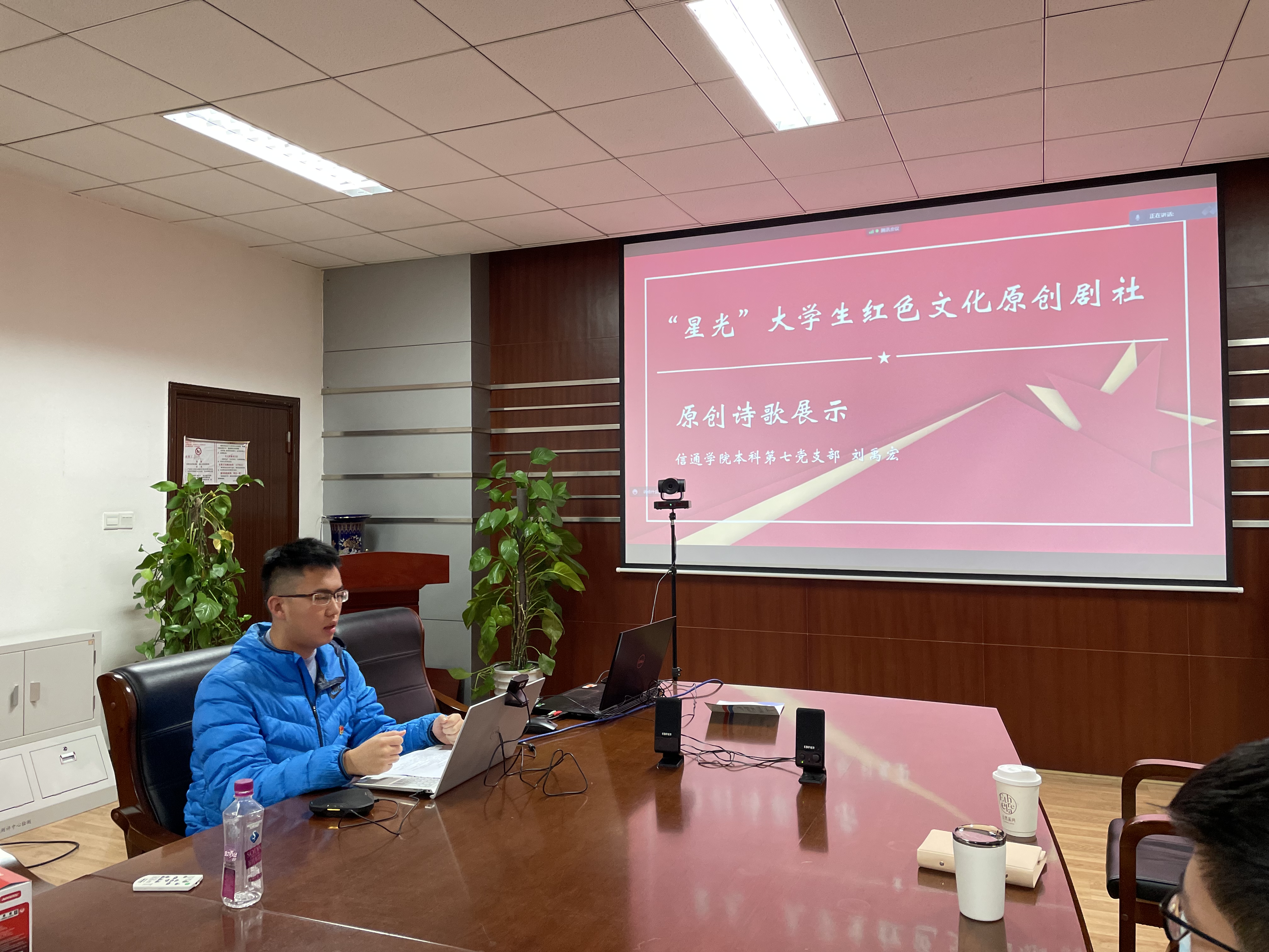 最后,工作室下属“星光”老员工红色文化原创剧社成员、本科第七党支部刘禹宏,结合“爱国奉献、科技报国”的学科精神带来原创诗歌展示。表达了对老一辈成电人、信通人无私奉献的赞美和对当代青年迎难而上、顽强拼搏的期待。