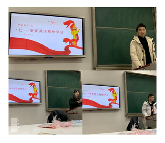 首先,党支部书记张浩天为全体党员上了一堂生动的关于“七一“重要讲话精神的学习党课——《听,激扬在百年党史中的青春之声》。他从革命将士们保家卫国、脱贫攻坚战的决定性胜利、新时代青年三个方面做出具体阐释。他讲到,深刻把握习近平总书记“七一”重要讲话的重大思想,我们青年人当要深刻把握伟大建党精神这个精神之源。“未来属于青年,希望寄予青年。”这是总书记对新时代中国青年寄予深厚的期许和深情的嘱托。