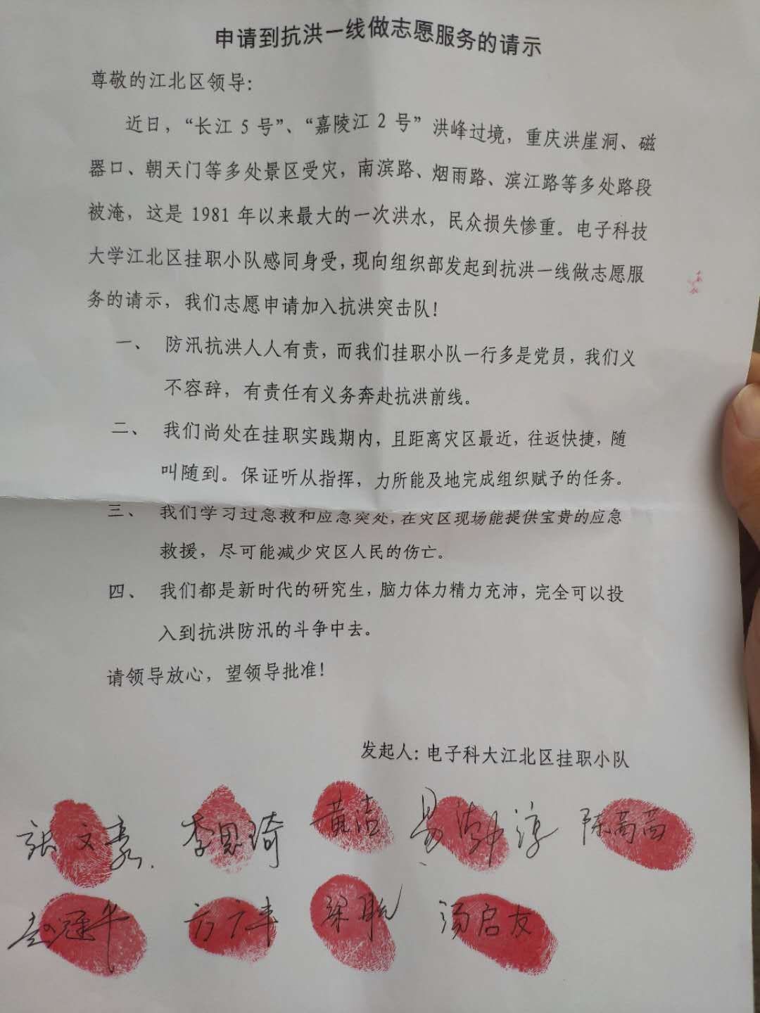 “长江涨水,包括洪崖洞、磁器口在内不少景点都被洪水淹没。”梁航回忆道。虽然实践活动已经告一段落,返校迫在眉睫,但亲眼看到家乡重庆被洪水肆虐,梁航无法轻易离开。8月20日晚上,梁航着手联系同行的同学,准备申请到抗洪一线参与防汛救灾工作。“大家也非常团结,同行同学里有的同学需要返校参加考试,也申请推迟了考试时间,一起留了下来。”梁航介绍道。当晚,队伍全员写下抗洪救灾的志愿书,并按上了自己的红手印,将这份志愿书交到了江北区组织部干部二科科长廖弦手中。