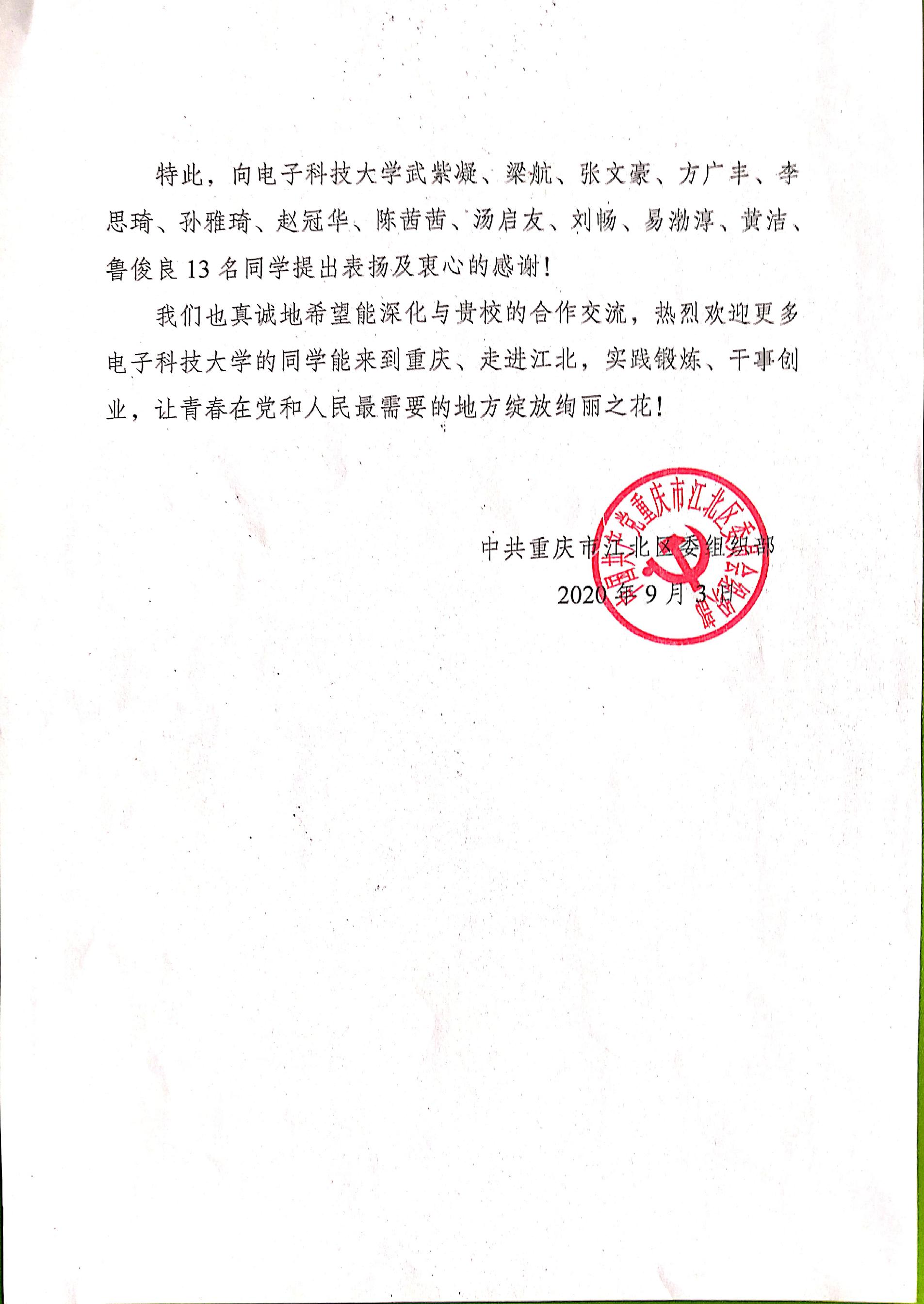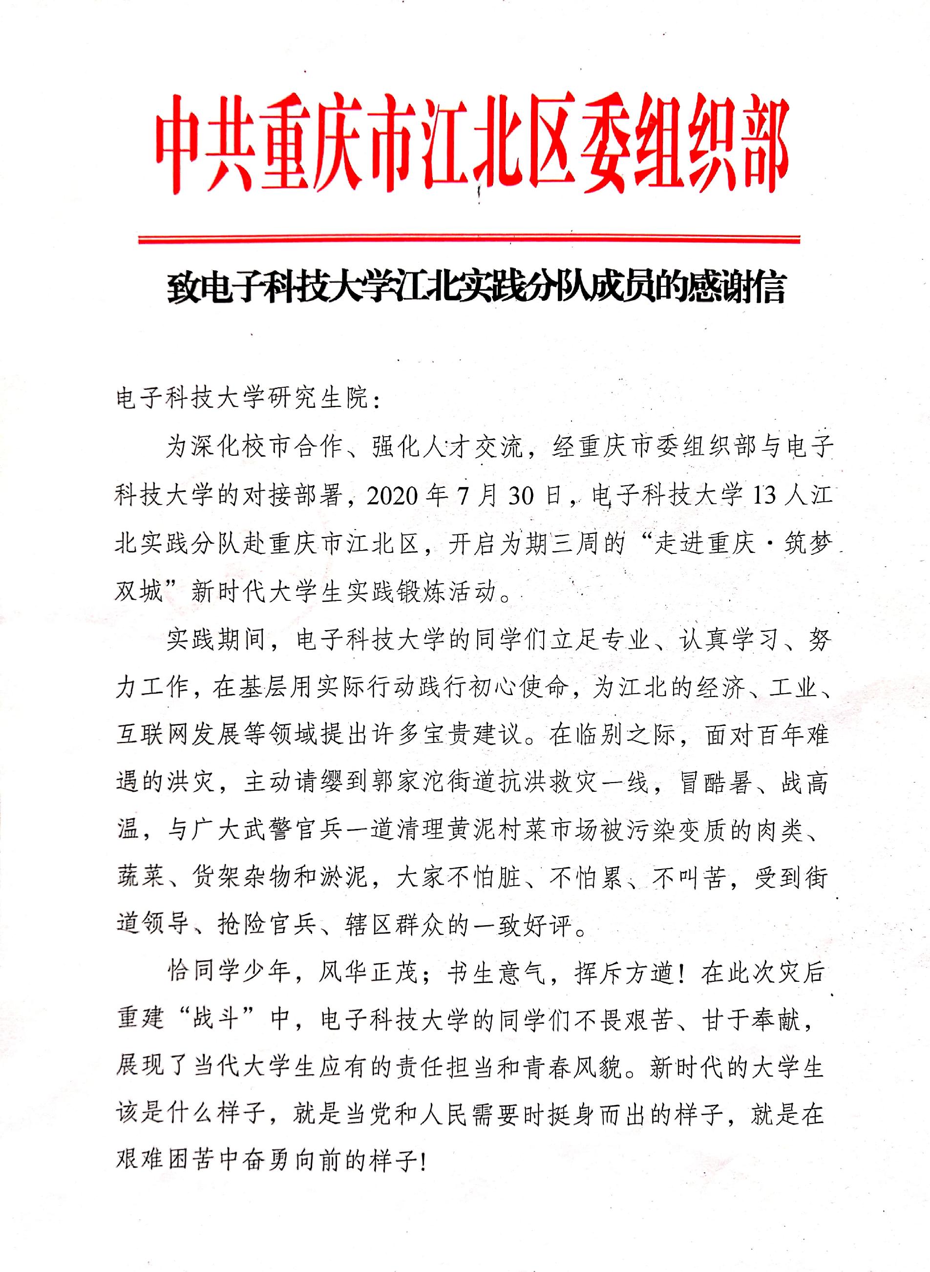 2020年秋季,梁航和往常一样回到公司,准备开始新学期的生活。一封来自重庆江北区委组织部的感谢信悄然寄到了成电校园。2020年8月,梁航正在重庆市江北区经信委进行挂职实践,过境重庆的洪峰却使这个八月格外地不同。