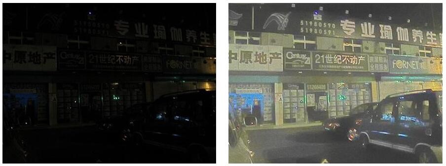 左图为夜间拍摄的暗光图像,右图为处理器处理后的图像