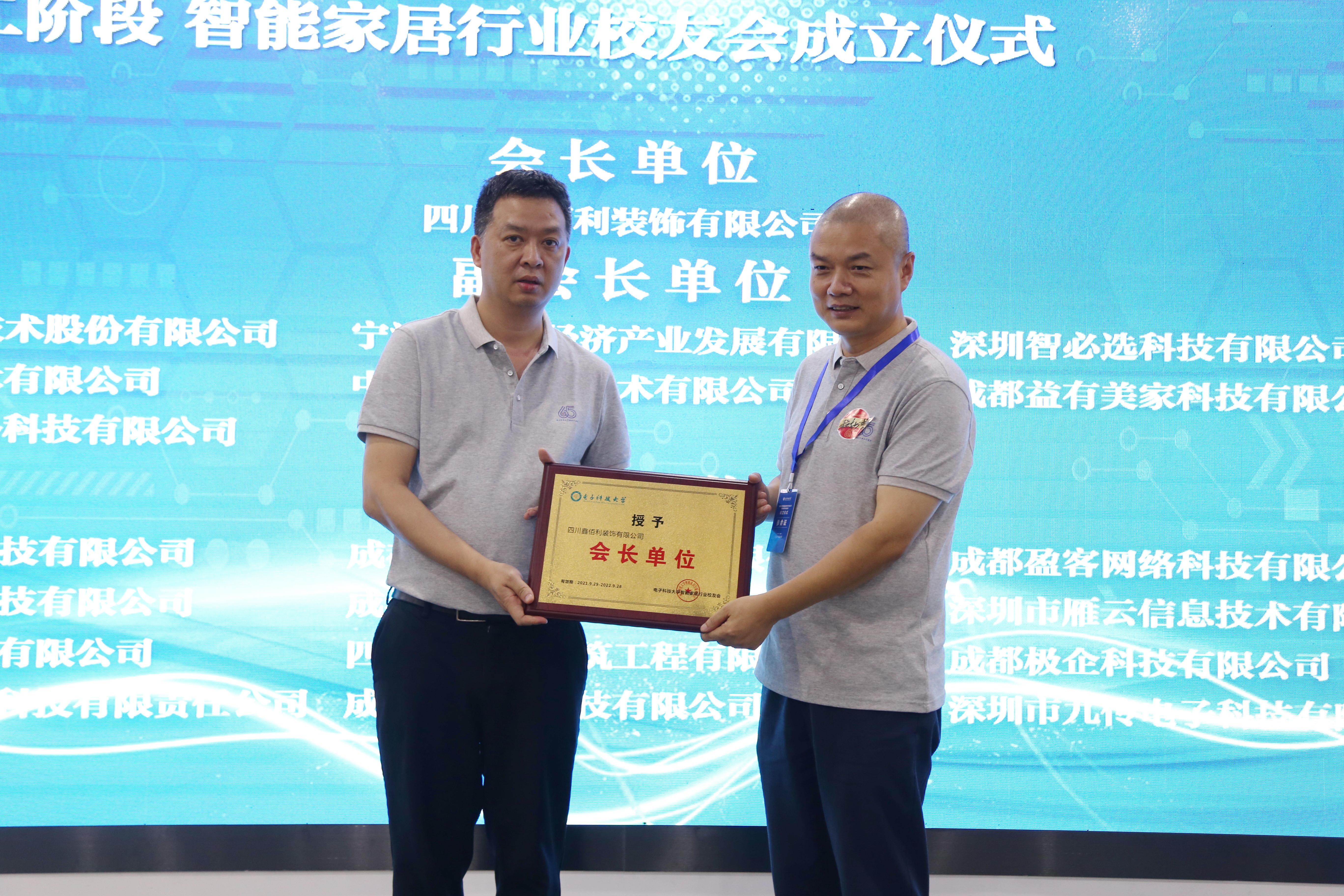 仪式后举行了智能家居行业员工会成立仪式。李会勇宣读了《关于同意智能家居行业员工会成立的函》,并向智能家居行业员工会会长陈新哲员工授牌。会长程新哲、副会长吴飞舟分别向副会长单位、会员单位授牌。