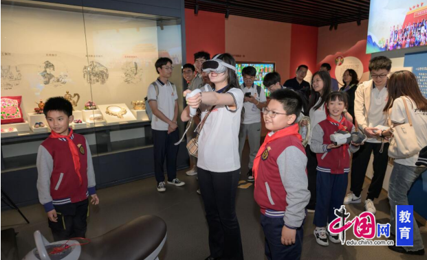 此外,在成都市回民小学“红领巾”讲解员的带领下,参与活动的师生们还参观了该校铸牢中华民族共同体意识主题教育基地——“爱我中华”民族魂教育展陈馆。通过亲身体验VR实景漫游、参观各民族精美文物等,师生们感受到了该校因校制宜,借助信息化手段创新民族团结进步教育的举措。