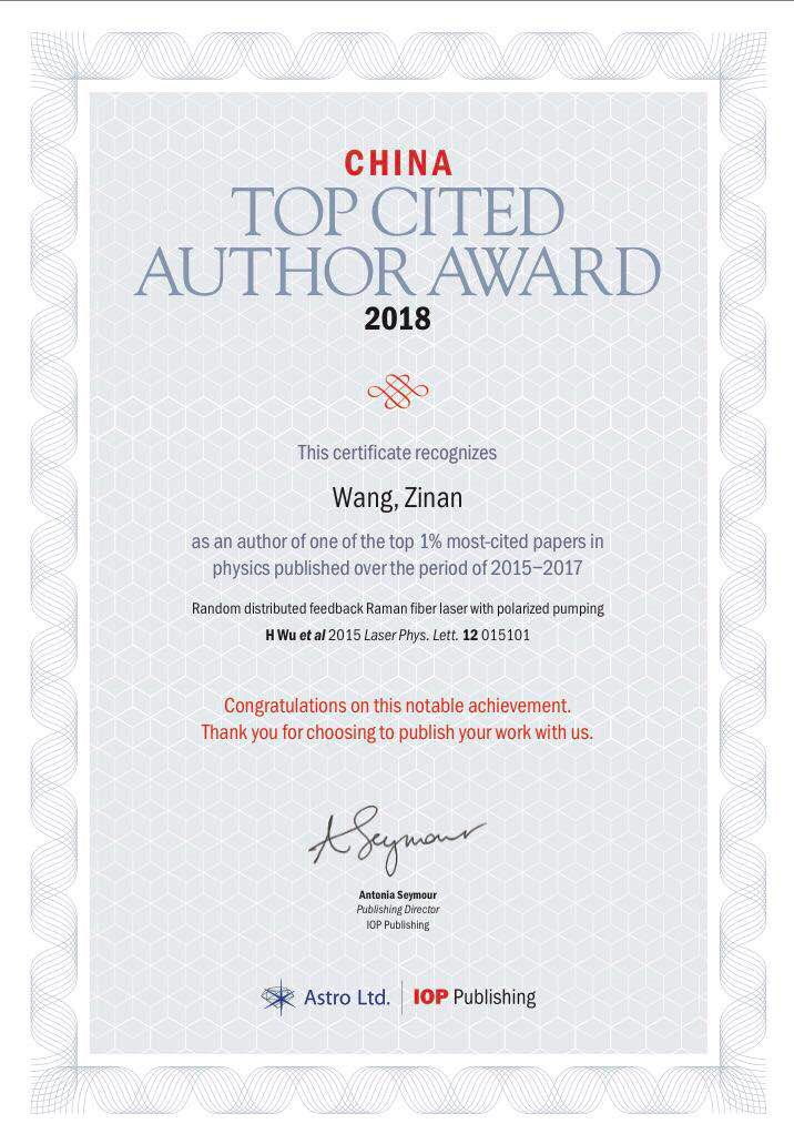 On August 23, 2018, the Institute of Physics Publishing (IOP Publishing), the renowned publishing house, released the "2018 IOP China Top Cited Authors Award" list. This award is presented to Chinese authors who have been the corresponding authors of papers that ranked in the top 1% of citations in IOP published journals over the past three years (2015-2017). This year, a total of 151 domestic scholars made the list, including six professors from our university. Professor Zinan WANG from SICE secured a place on the list with his paper titled "Random distributed feedback Raman fiber laser with polarized pumping."